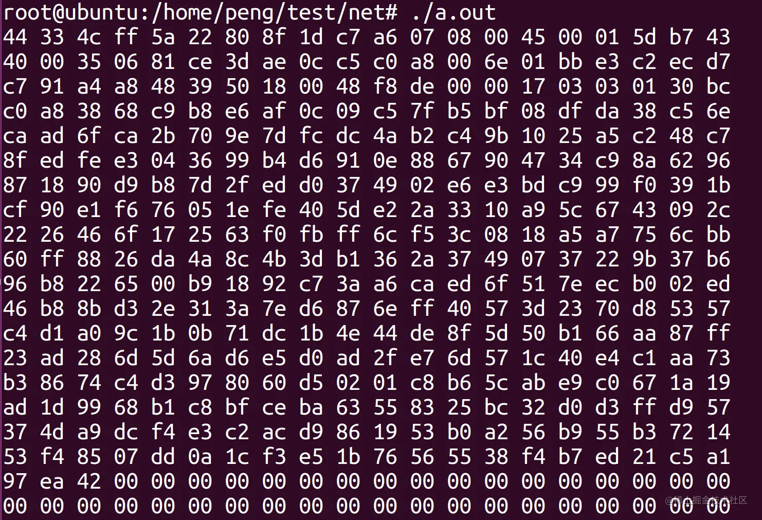 注意,数据包中的数据是网络字节序,如果要提取数据一定要注意字节序问题 ethh->h_proto 是short类型,占2个字节,所以存储到本地需要使用函数ntohs 其中: n:network 网络字节序 h:host 主机字节序 s:short 2个字节 l:long 4个字节 ntohl() :4字节网络字节序数据转换成主机字节序 htons() :2字节主机字节序数据转换成网络字节序 ntohs() :2字节网络字节序数据转换成主机字节序 htonl() :4字节主机字节序数据转换成网络字节序