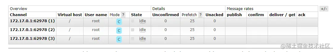 - Channel是如何产生的? 那么什么情况下会产生Channel?Channel过多是否会有问题呢?下面笔者就引用官方的话。 每个通道在客户端上消耗的内存量相对较小。根据客户端库的实现细节,它还可以使用一个专用的线程池(或类似的)来调度消费者操作,因此一个或多个线程(或类似的)。 那么官方都已经说小号内存相对比较小,那么笔者作为莽夫,肯定就不关他啦! 说回Channel是如何产生的呢?刚刚说了很多关于Channel的,共享TCP连接,通过Channel做资源隔离,那么肯定就能想到Channel是通过消费者监听的数量来决定去创建多少个Channel的,也就导致了Channel的资源隔离