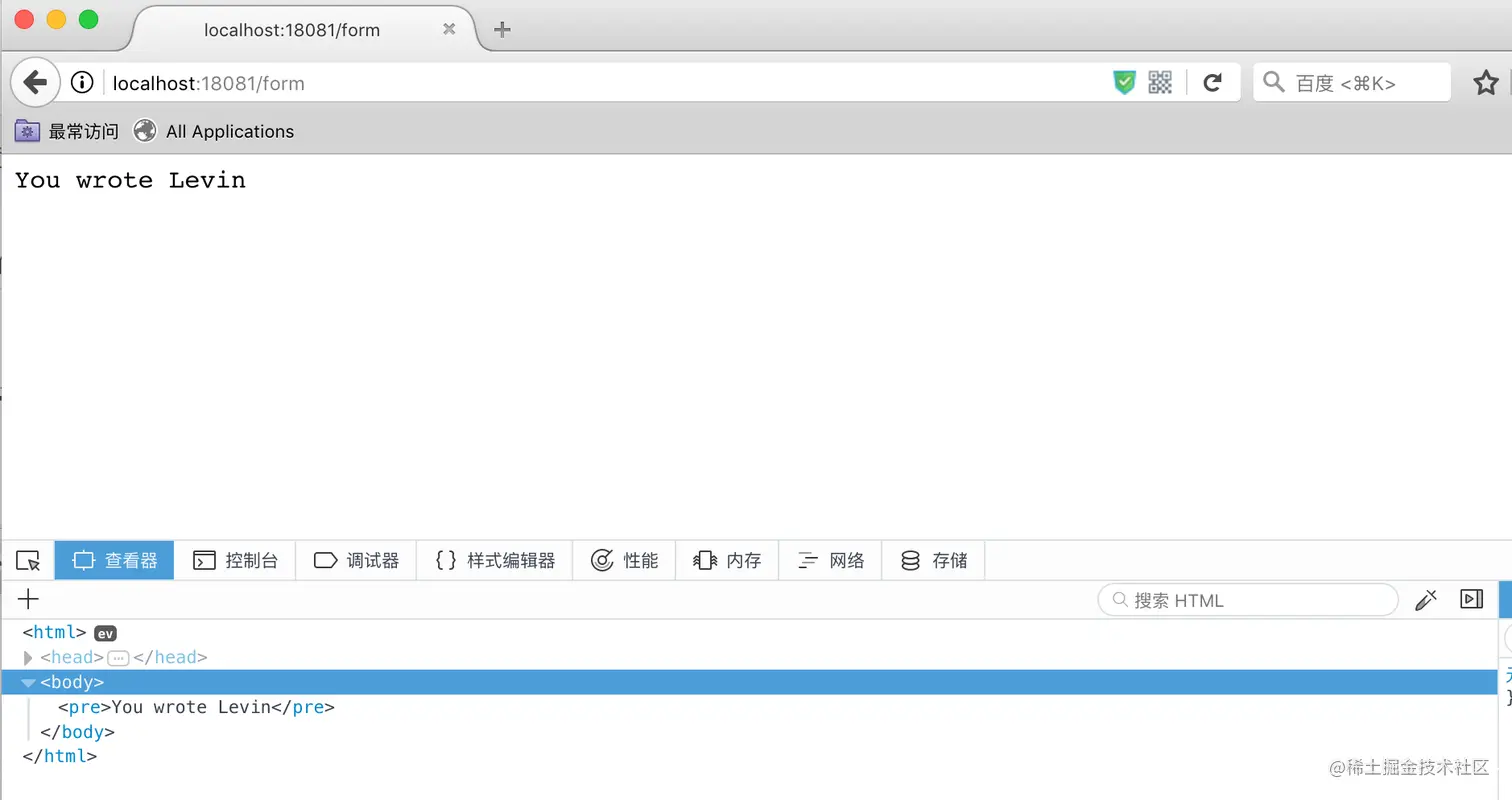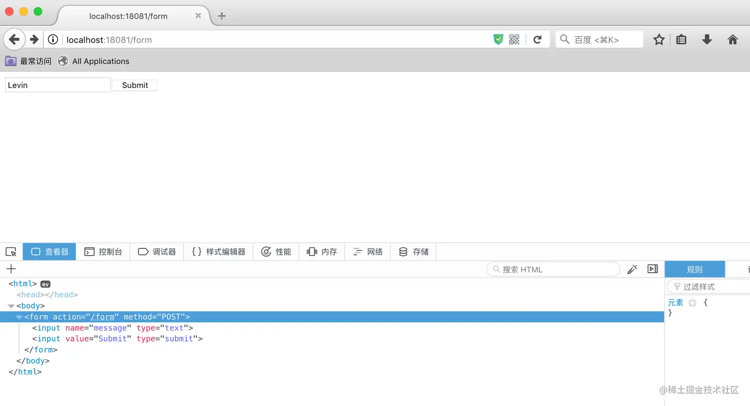看看页面渲染的效果,没有内嵌任何js,这个submit按钮就直接把发起了POST请求给“/form”接口。