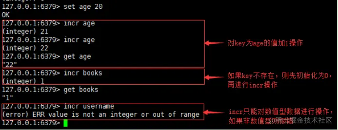 功能:将 key 中储存的数字值加1,如果 key 不存在,则 key 的值先被初始化为 0 再执行incr 操作。