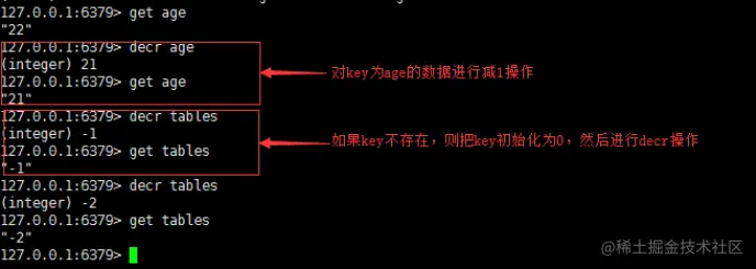 功能:将 key 中储存的数字值减1,如果 key 不存在,则么 key 的值先被初始化为 0 再执行 decr 操作。