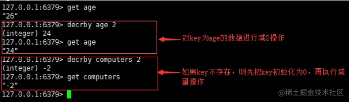 功能:将 key 所储存的值减去减量值,如果 key 不存在,则 key 的值先被初始化为 0 再执行 DECRBY 命令。