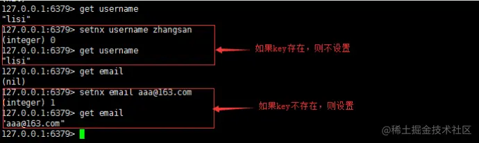 功能:setnx 是 set if not exists 的简写,如果key不存在,则 set 值,存在则不设置值。