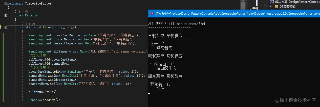 这里菜单打印直接用foreach 循环打印菜单组件,如果遇到另外一个菜单对象则进入子菜单打印。此处就是使用迭代器模式,只不过我偷了个懒直接用了foreach,因为list C#已经实现了迭代器,使用foreach语法即可。《C# Foreach循环本质与枚举器》