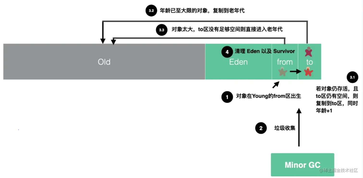 - 年轻代又会分为Eden和Survivor区,Survivor也会分为FromPlace和ToPlace,Eden、FromPlace和ToPlace的默认占比为 8:1:1。