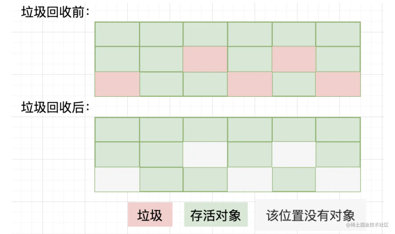 - 标记-清除算法会产生大量内存碎片,以后如果需要为大对象分配内存空间时,若无法找到足够的连续的内存空间,就会提前触发一次GC回收操作。