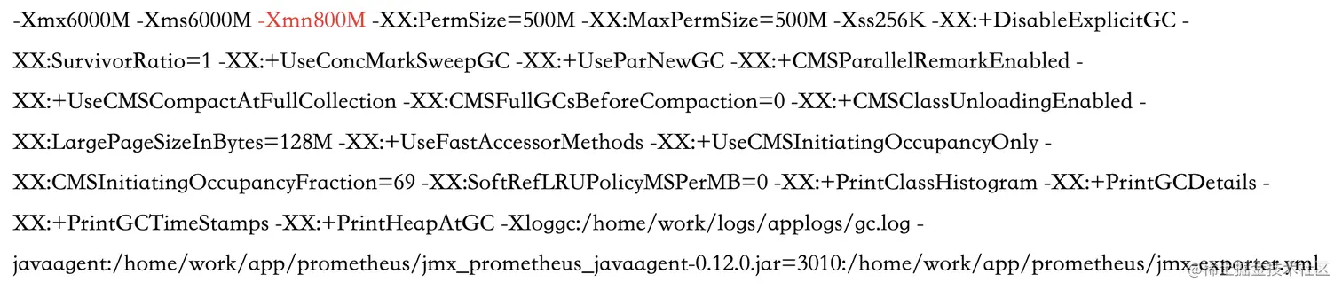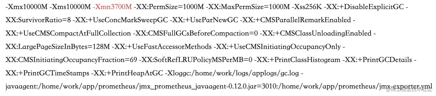 - “-Xmx6000M -Xms6000M”,可以确定JVM内存大小为6000/1024=5.8G,之前计算的堆内存大小为6.1G,基本匹配(多余的可能分配给了永生代)