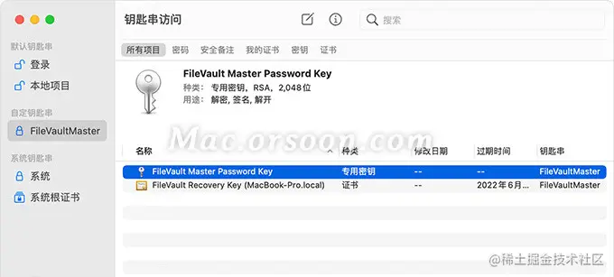 2.在“钥匙串访问”边栏中,选择“FileVaultMaster”。