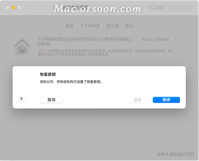 4.如果文件保险箱已关闭,请打开“安全性与隐私”偏好设置并开启“文件保险箱”。您应该会看到一条信息,表明您的公司、学校或组织已设置了恢复密钥。点按“继续”。