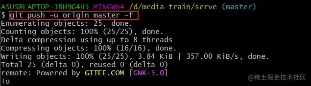 7.解决方法:由于是初始化项目,就直接覆盖了远程仓库所有代码,但是千万注意这个方式不太可取,防止覆盖不应该覆盖的代码,注意! git push -u origin master -f