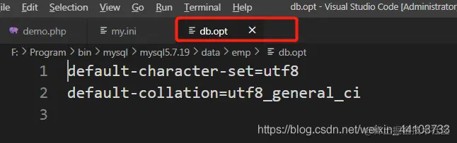 一个数据库对应一个文件夹,在文件夹中有一个db.opt文件,在此文件中设置数据库的字符集和校对集: