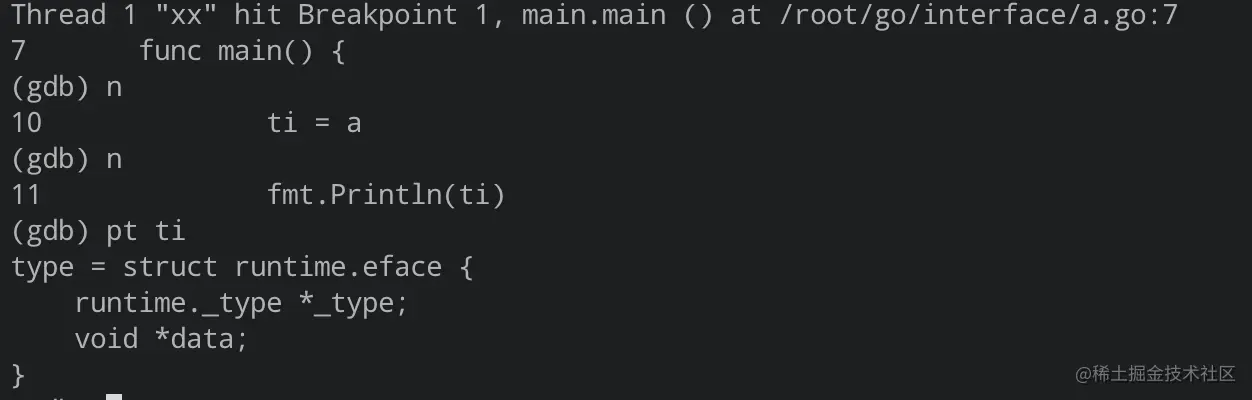 这段汇编从直观上来说,interface 转换成 eface 是看不出来的。这个如何观察呢?这个就需要借助 gdb 了。
