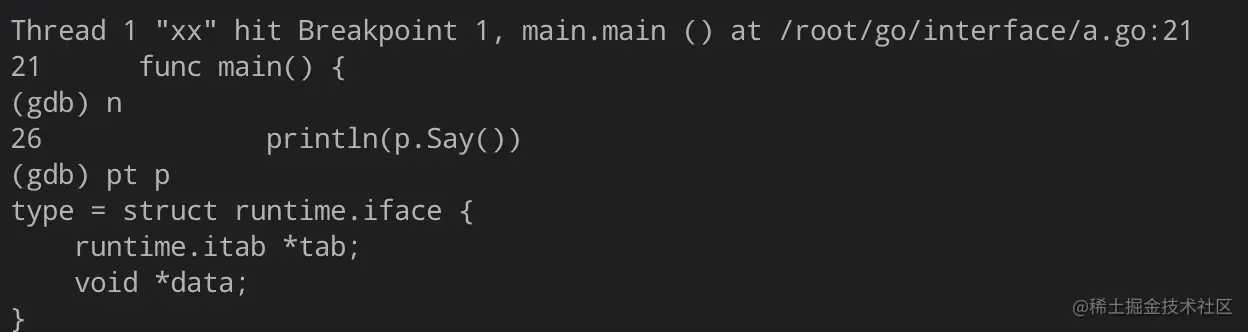 同样,我们继续用 gdb 查看 Person interface 确实被转换成了 iface。