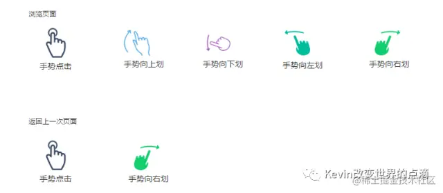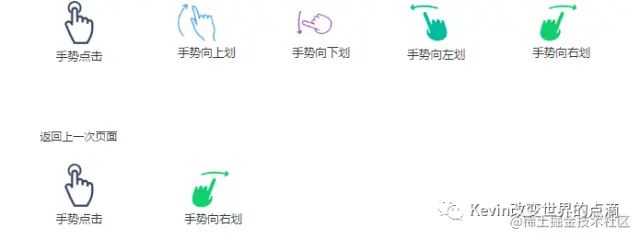 以上为移动端内的页面内交互,可以看到基本为目前常见的人类手势,当然还有长安、双击等交互,目前以上列举的是比较常见的一些手势