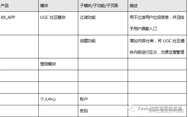在对于UGC模块中,我将相应的子功能进行罗列,那么这里我们需要以用表格的方式进行统计,方便设计、开发人员以及测试人员对工作量的评估。