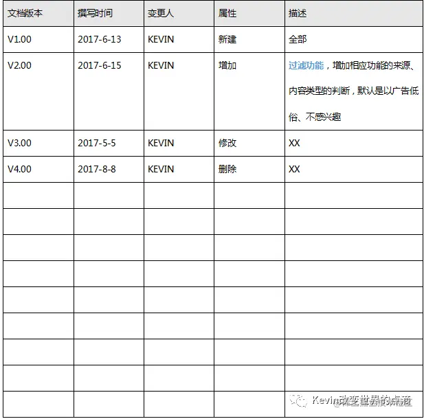 这一块是我认为3年工作中,最为重要的一块。最初做产品助理时候,文档更新可能就是很简单的一句话,但随后发现,开发与测试人员每次最关注的就是你更新记录,他可不想每次都去查找那一小部分更新内容。