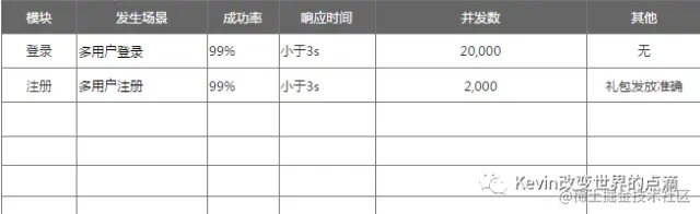 性能需求可以以表格的形式对相应的功能模块进行要求,如红包点击弹出的时间在3S内,成功率是99%,并发数是20000。
