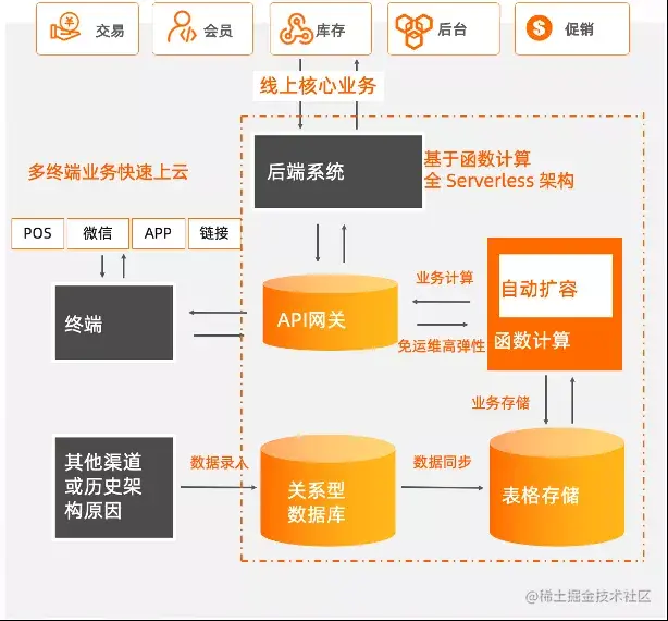 某零售商超行业的龙头企业,其主要业务涵盖购物中心、大卖场、综合超市、标准超市、精品超市、便利店及无人值守智慧商店等零售业态,涉及全渠道零售、仓储物流、餐饮、消费服务、数据服务、金融业务、跨境贸易等领域。为了持续支持业务高速且稳定地发展,其在快速上云后,将核心业务改造为全 Serverless 架构的中台模式,采用函数计算 + API 网关 + 表格存储 OTS 作为计算网络存储核心,弹性支撑日常和大促峰谷所需资源,轻松支撑 618/ 双 11/ 双 12 大促。