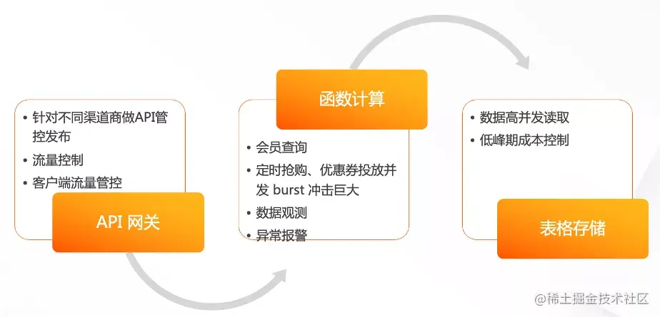 另外计算也是一个非常重要的问题,客户经过探索发现阿里云函数计算 FC 非常契合其业务场景。比如定时抢购、优惠券投放等活动造成巨大的 burst 冲击,当发现计算资源不够的时候再去买机器肯定是来不及的,而函数计算及时扩容的功能就很好地解决了这个问题。另外其数据观测和异常报警功能,也吸引到了客户。