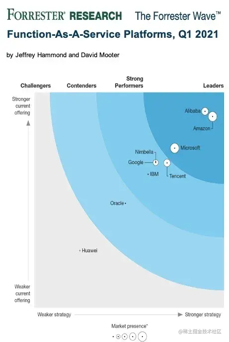 今年 3 月,权威咨询机构 Forrester 发布 2021 年第一季度 FaaS 平台评估报告,阿里云函数计算凭借在产品能力、安全性、战略愿景和市场规模等方面的优势脱颖而出,产品能力位列全球第一,这也是首次有中国云厂商进入 FaaS 领导者象限。
