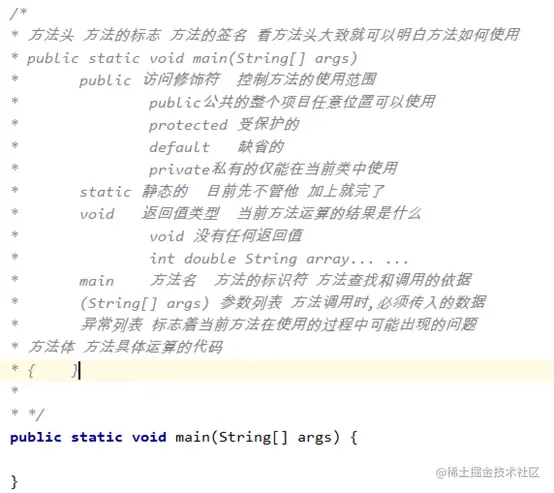 - 方法体:方法体包含具体的语句,定义该方法的功能。