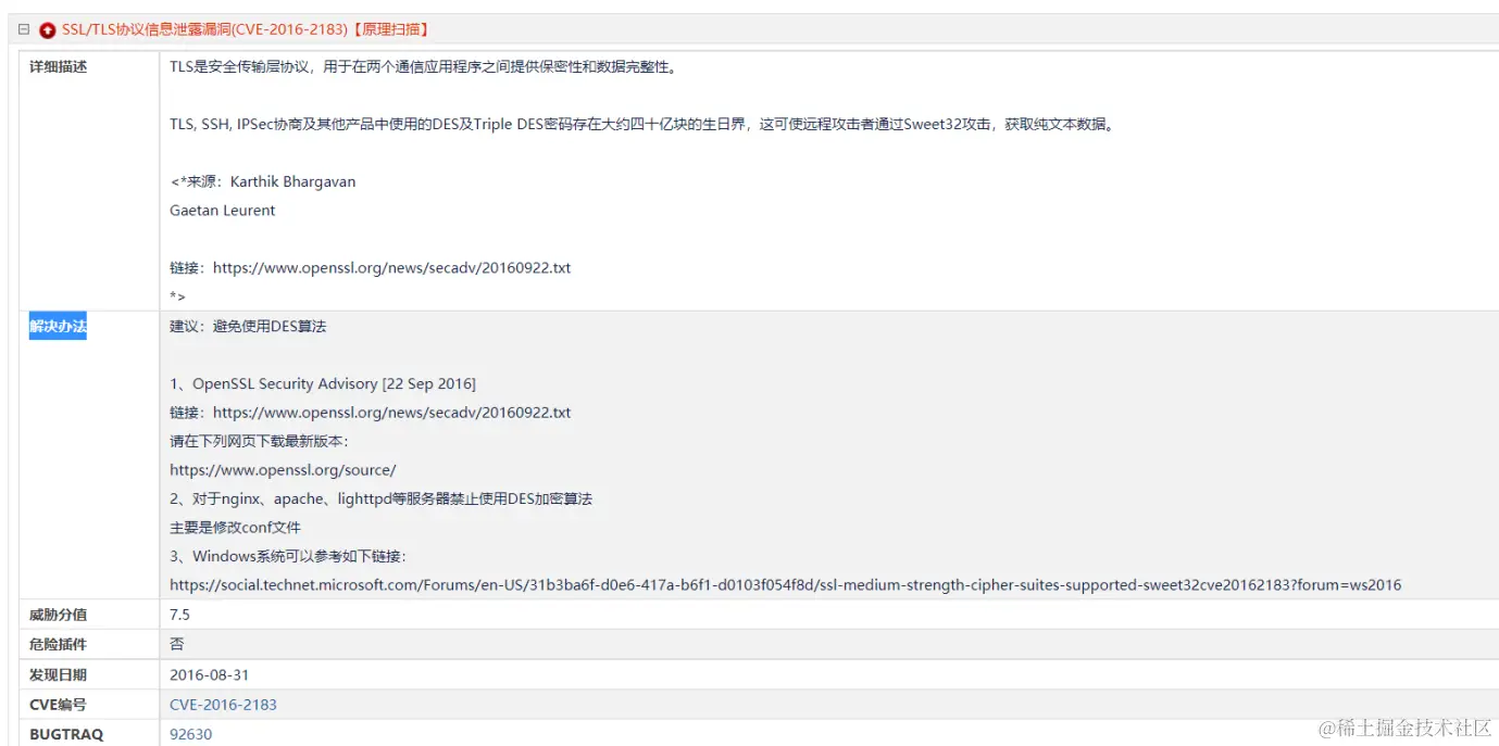 TLS是安全传输层协议,用于在两个通信应用程序之间提供保密性和数据完整性。TLS、SSH、IPSec协商及其他产品中使用的DES及Triple DES密码存在大约四十亿块的生日界,这可使远程攻击者通过Sweet32攻击,获取纯文本数据。