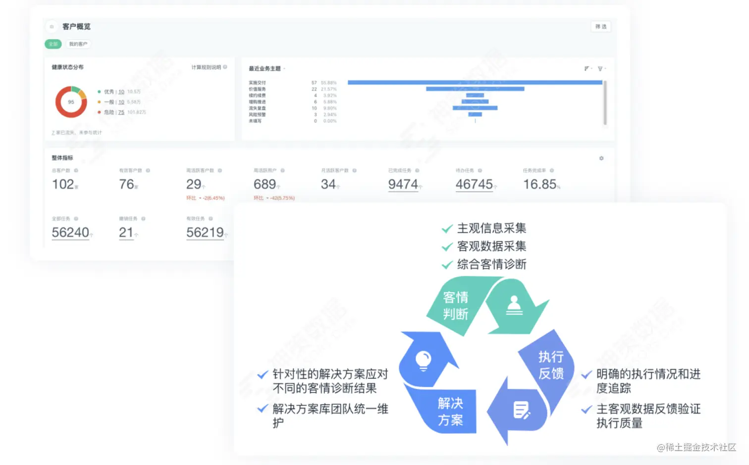在企业服务客户全生命周期过程中,实现“通过主客观数据的反馈”验证解决方案的执行质量是关键的一环。主观上,主要指回访等描述性信息,无法通过任何客观指标进行评价,但也具有较高的参考价值。客观上,主要指数量化的指标,一般可分为四个方面对解决方案的落地效果进行反馈和分析:其一,客户的活跃账号数;其二,活跃用户的占比;其三,客户的健康状态;其四,一些与业务相关的其它指标。