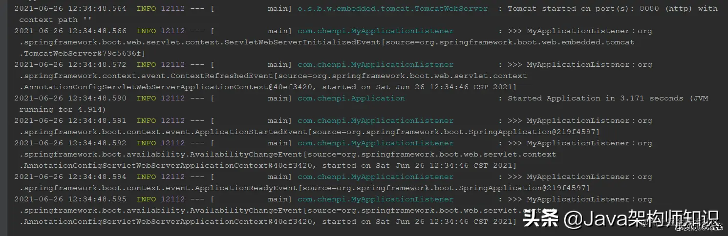 2021-06-26 16:15:09.606 INFO 10992 --- [ main] com.chenpi.MyApplicationListener : >>> MyApplicationListener:MyApplicationEvent{myField='我是自定义事件属性', source=我是事件源,项目启动成功后发布事件}