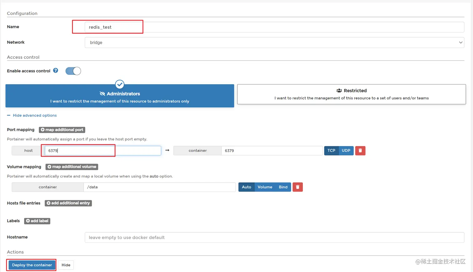 填写以下容器名称、映射到主机的端口号,直接点部署