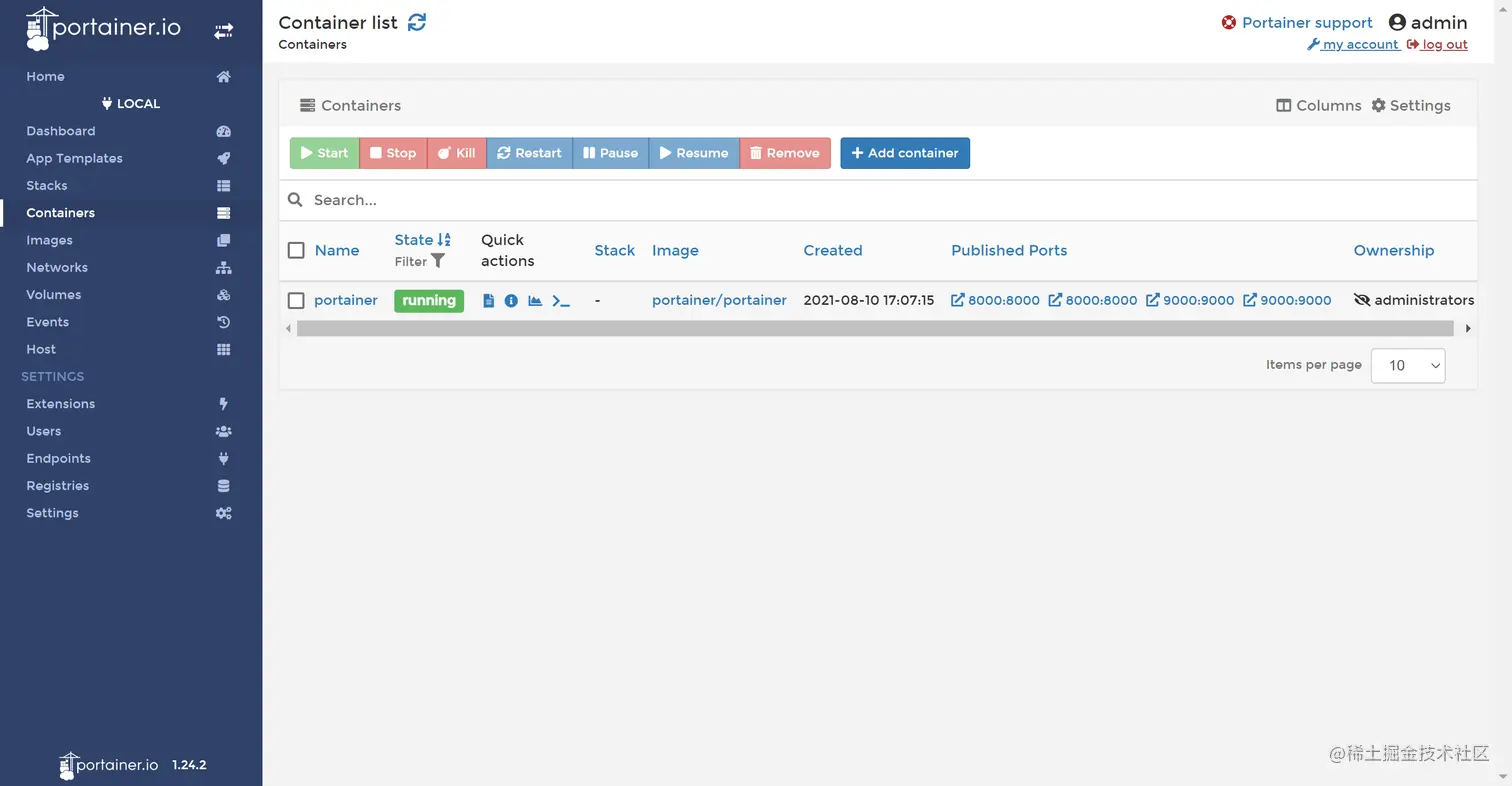 Docker 的可视化管理工具有很多,代表性的有 Portainer和 DockStation,前者是Web端,可以用容器运行,后者是桌面客户端,比较笨重,本文的目的是快速搭建,所以选择的是Portainer