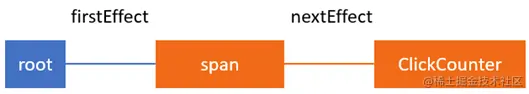 在我们的例子中,由于span节点ClickCounter组件有副作用,React将添加指向spanFiber节点的链接到HostFiber的firstEffect属性。