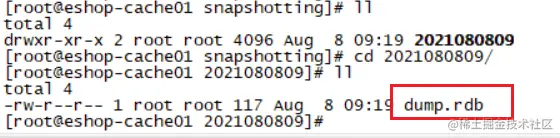 会在 snapshotting 文件夹创建一个目录:2021080809,表示这是 2021-08-08 09 时的备份文件夹(注意这个时间是 UTC 时间)。这个目录里面还会有一个 dump.rdb 文件。如下图所示: