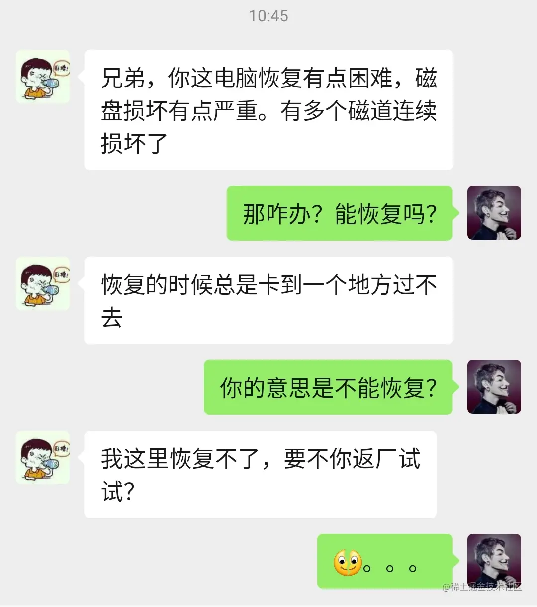 下班后,第一时间来到电脑维修店,那小哥也确实没下班,我问他:真的不能修复了? 他说:我确实修复不了,建议返厂试下。 我说:是磁盘坏了吧?返厂的话能不能只把磁盘返厂修?主要是恢复下数据,其他的不重要。 他说:最好是整机返厂。 哎,没办法了,返厂就返厂吧,最好是把数据恢复。