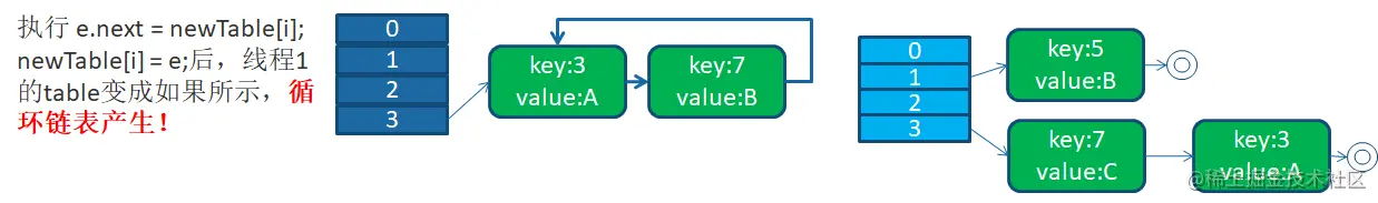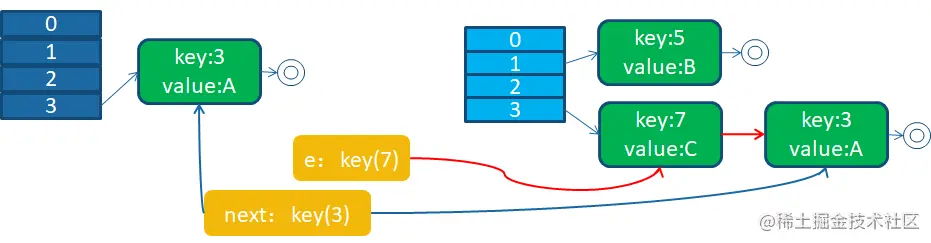 然后开始第三轮循环。e和next都是key3。所以根据头插法。key3又要插入key7之前,这就导致了key3.next为key7,key7.next为key3