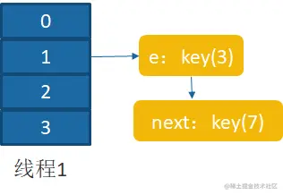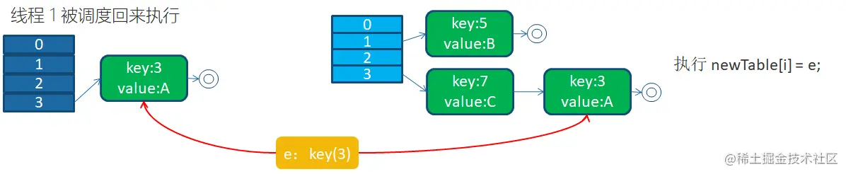 当线程1被调度回来执行之后,因为线程一执行的e.next =newTable[i];将key3插入到3号位置,同时3.next=key7。此时e=key3,next=key7;