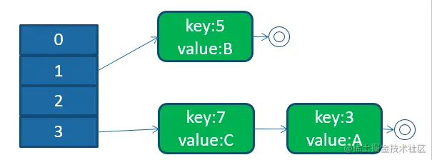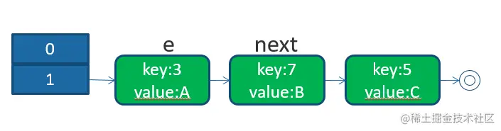 table[bucketIndex] = new Entry<>(hash, key, value, e);//这里执行链接操作,使得新插入的元素指向原有元素。
