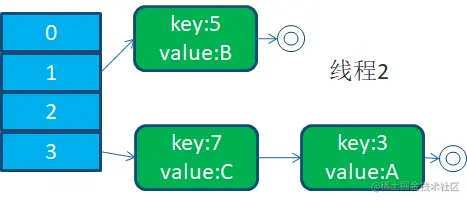 在多线程环境下有线程一和线程二,同时对该map进行扩容执行扩容。