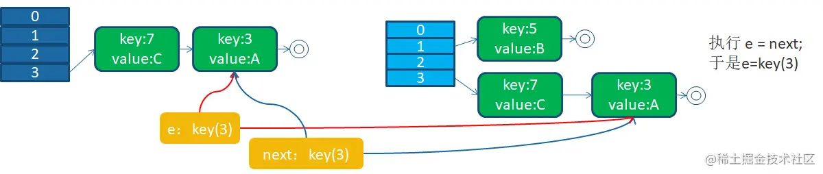 之后通过头插法,将key7插入key3之前。在执行完next=e.next 之后,e=key3,next=key3;