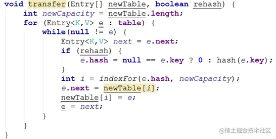 3、当数组扩容完毕,需要重新计算所有的元素的位置,然后插入对应的位置当中。扩容方法主要为resize以及resize中的transfer方法,不在细说