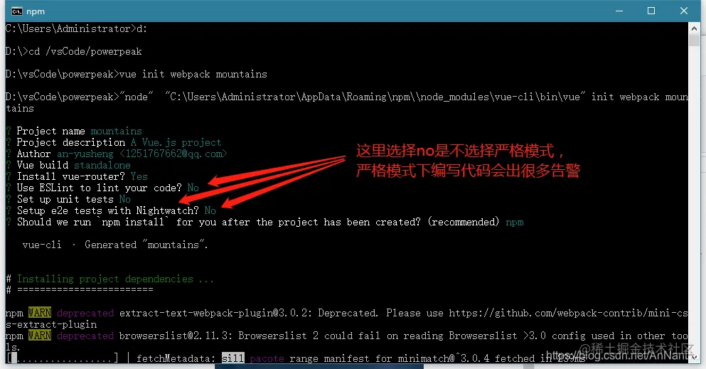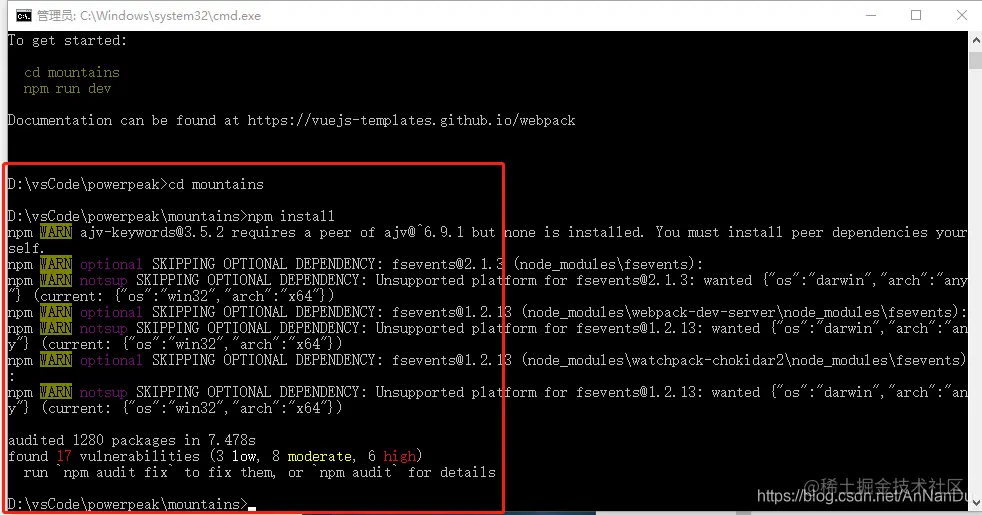 创建完成以后cd到项目路径下执行命令npm install 或者 cnpm install 来安装依赖包