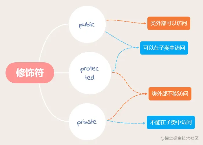 - protected: 修饰的属性或方法是受保护的,它和 private 类似,区别是它在子类中也是允许被访问的