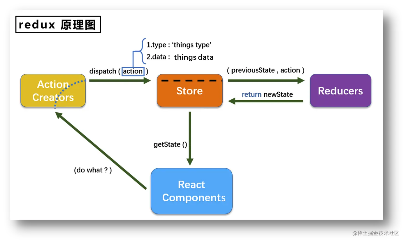 getState(): 得到statedispatch(action): 分发action, 触发reducer调用, 产生新的statesubscribe(listener): 注册监听, 当产生了新的state时, 自动调用