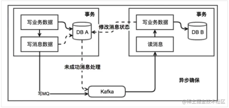 本地消息表与业务数据表处于同一个数据库中,这样就能利用本地事务来保证在对这两个表的操作满足事务特性,并且使用了消息队列来保证最终一致性。