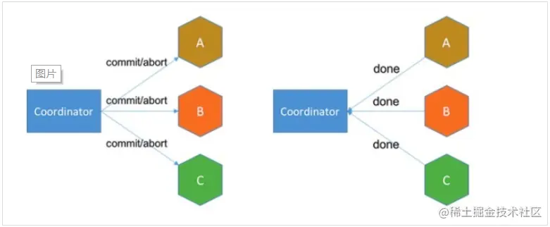 如果事务在每个参与者上都执行成功,事务协调者发送通知让参与者提交事务;否则,协调者发送通知让参与者回滚事务。