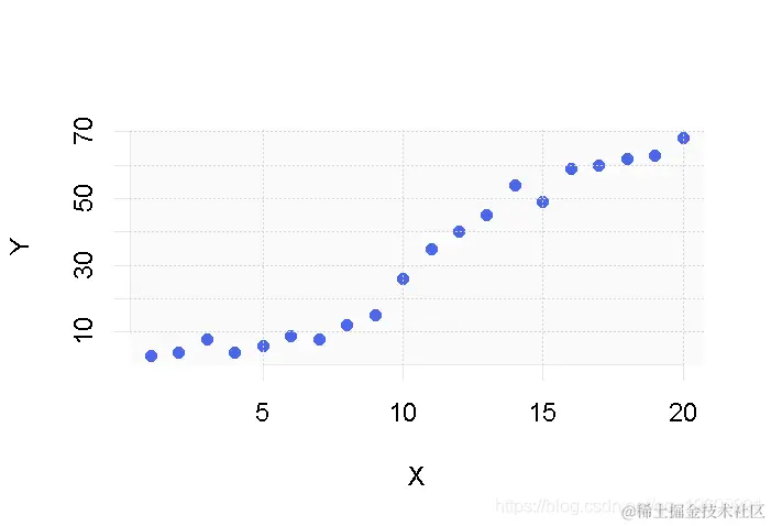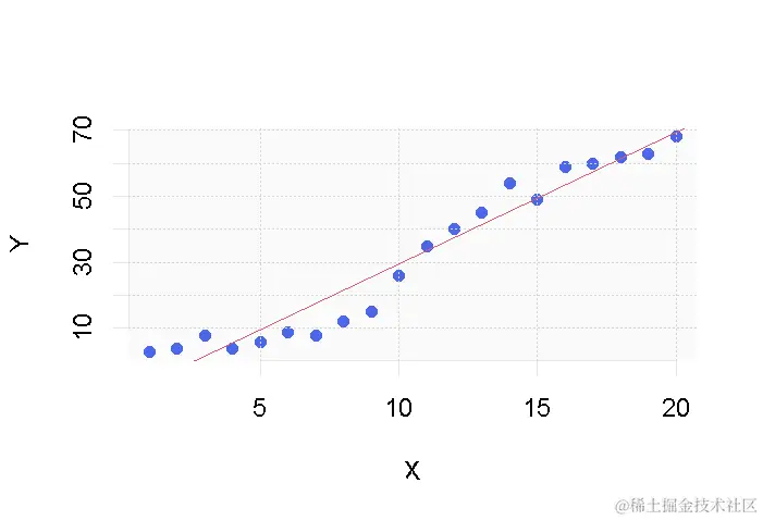 正如你所看到的,在我们的两个变量X和Y之间似乎存在某种关系,看起来我们可以拟合出一条在每个点附近通过的直线。