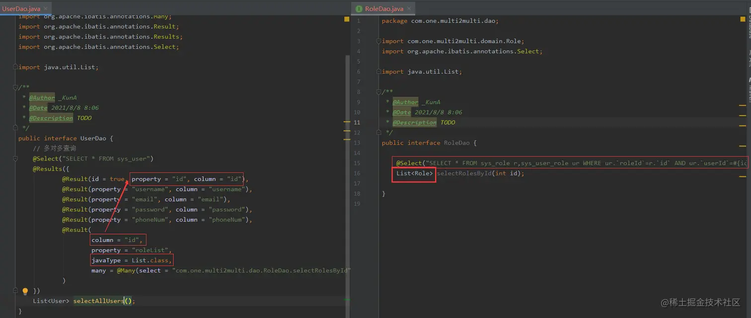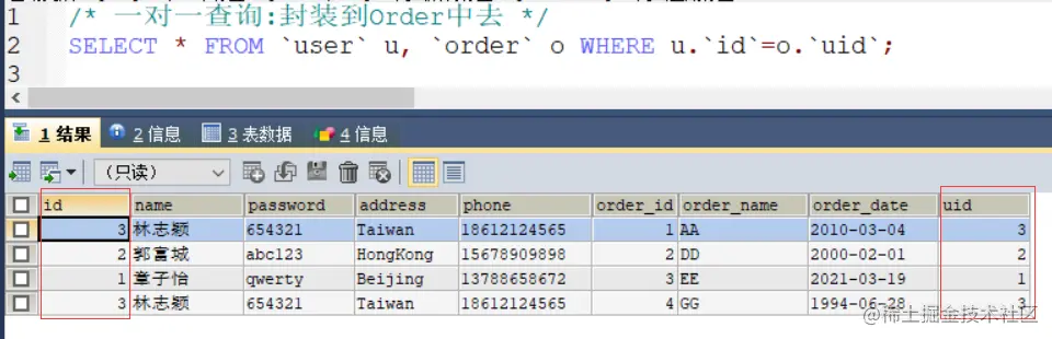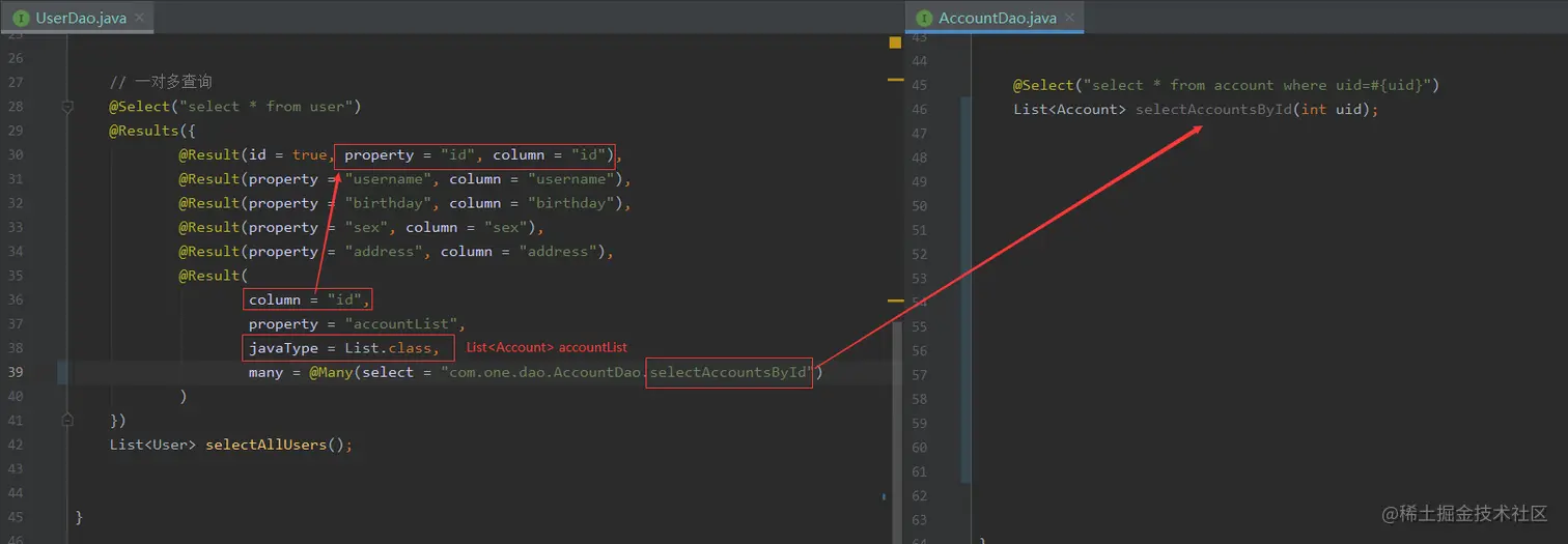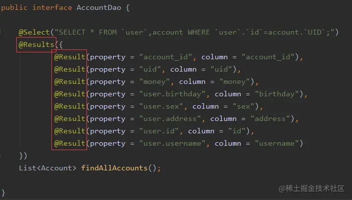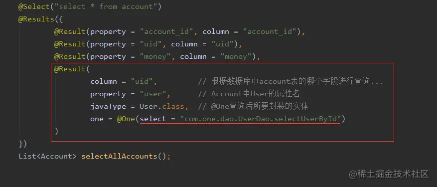 SELECT * FROM account + SELECT * FROM user WHERE id=#{id},于是便有了如下第二种一对一注解查询方式。
