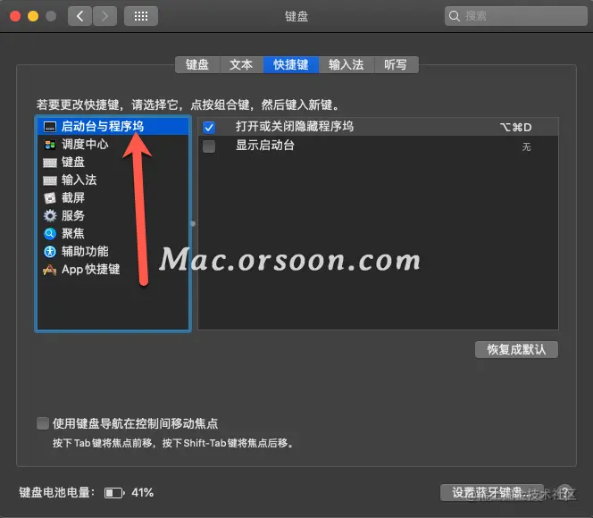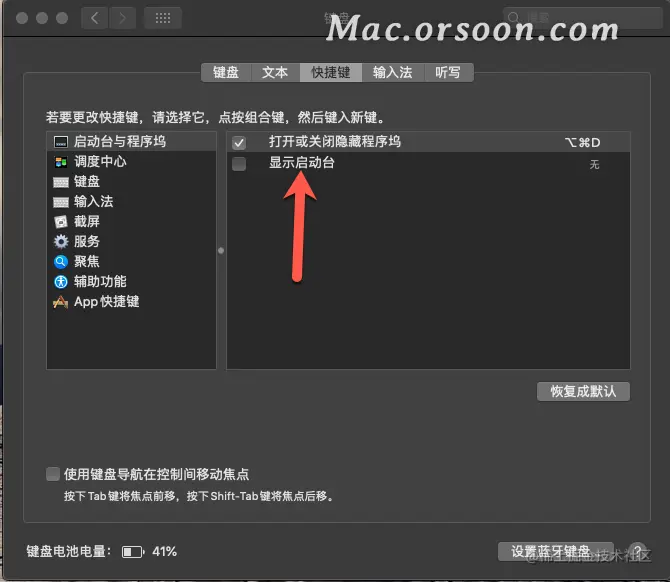 【新手指南】如何更改mac中默认Launchpad快捷键? Windows阿咪 2021-08-11 638 阅读1分钟 下面分享如何更改mac中默认Launchpad快捷键? 具体方法如下: 1.点击左上角的苹果图标,点击“系统偏好设置”。 2.然后在系统偏好设置面板中找到并点击进入到“键盘”的设置中。 3.进入键盘设置后,点击切换到“快捷键”的设置。 4.在快捷键设置中,点击左侧面板,切换到“启动台”的设置。 5.然后勾选右侧面板的“显示启动台”,然后按快捷键,这样就把快捷键设置成自己想要的了。 是不是很简单呢!更多mac教程欢迎关注 ‘未来软件园’了解。