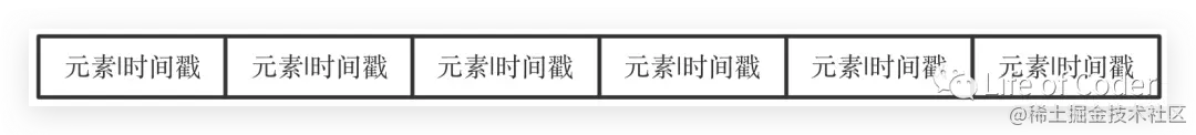 这是一种比较普通的实现,即将所有的元素存在数组中,然后每个元素还携带一个时间戳(最近访问时间)。这样就可以根据时间戳来找到最近访问最少的元素。其大概结构如下图。