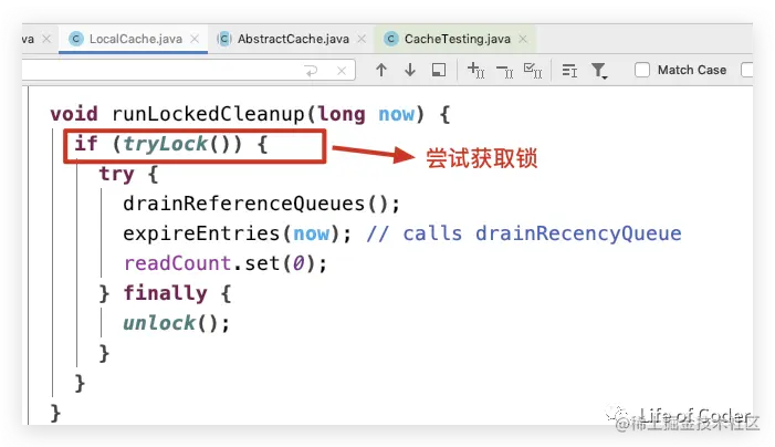 如下图:每次get完元素之后都会执行一下如下代码(调用链:segment.get->postReadCleanup->cleanUp->runLockedCleanup):