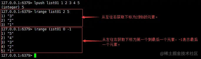 功能:获取列表 key 中指定下标区间内的元素,下标从0开始,到列表长度-1;